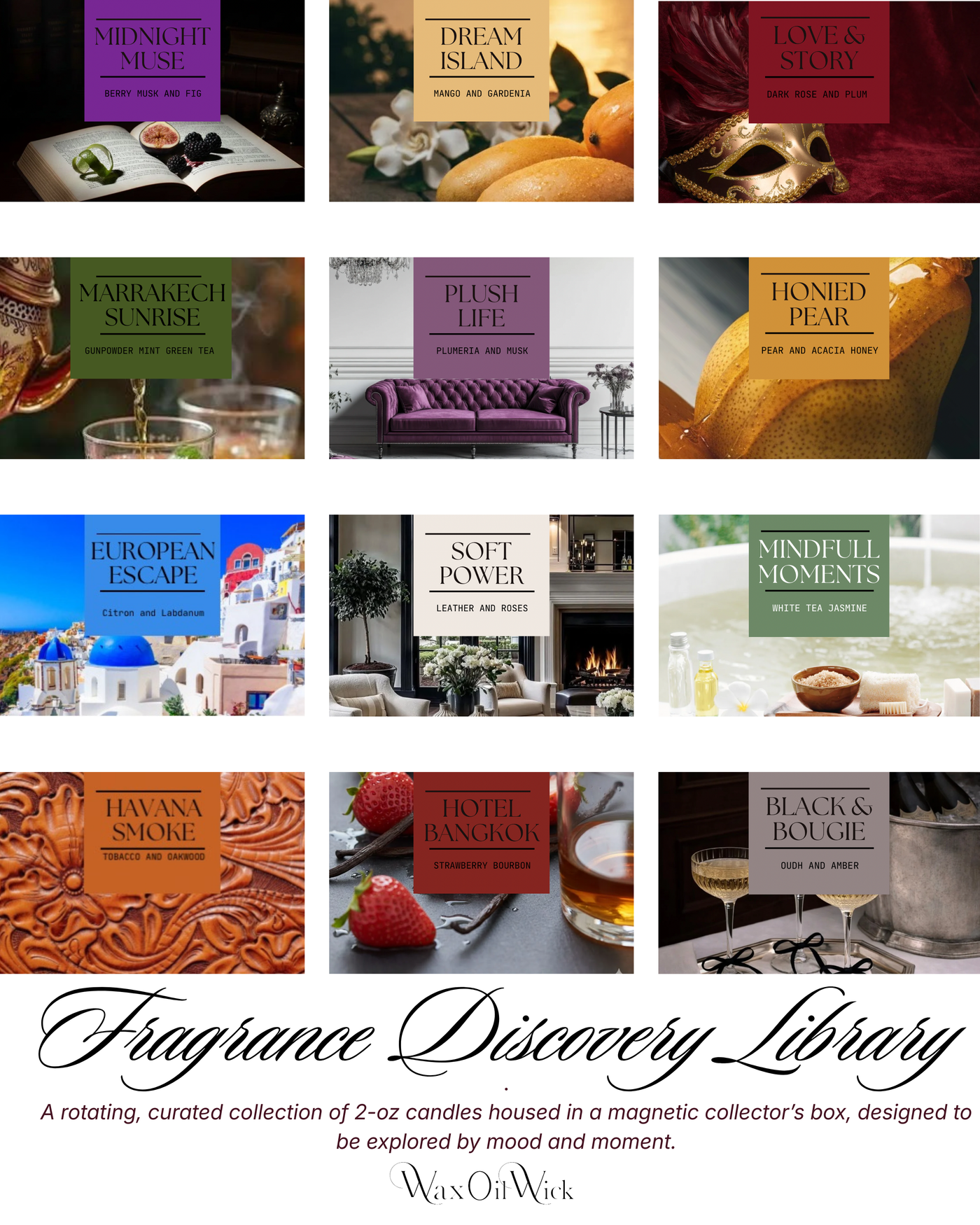The Fragrance Discovery Library is a rotating, curated luxury candle discovery set featuring 2-oz candles, thoughtfully housed in a magnetic collector’s box.